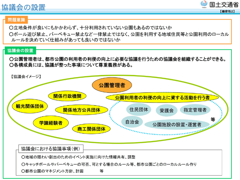 公園を対象とした協議会制度は、平成29年の都市公園法の改正によって創設されました。公園管理者(市)が、公園の利用者の利便向上に必要な協議を行うため、自治会などの地域関係者と協議会を組織し、公園独自のルールづくりなどを行い、公園の有効活用に取り組むものです。