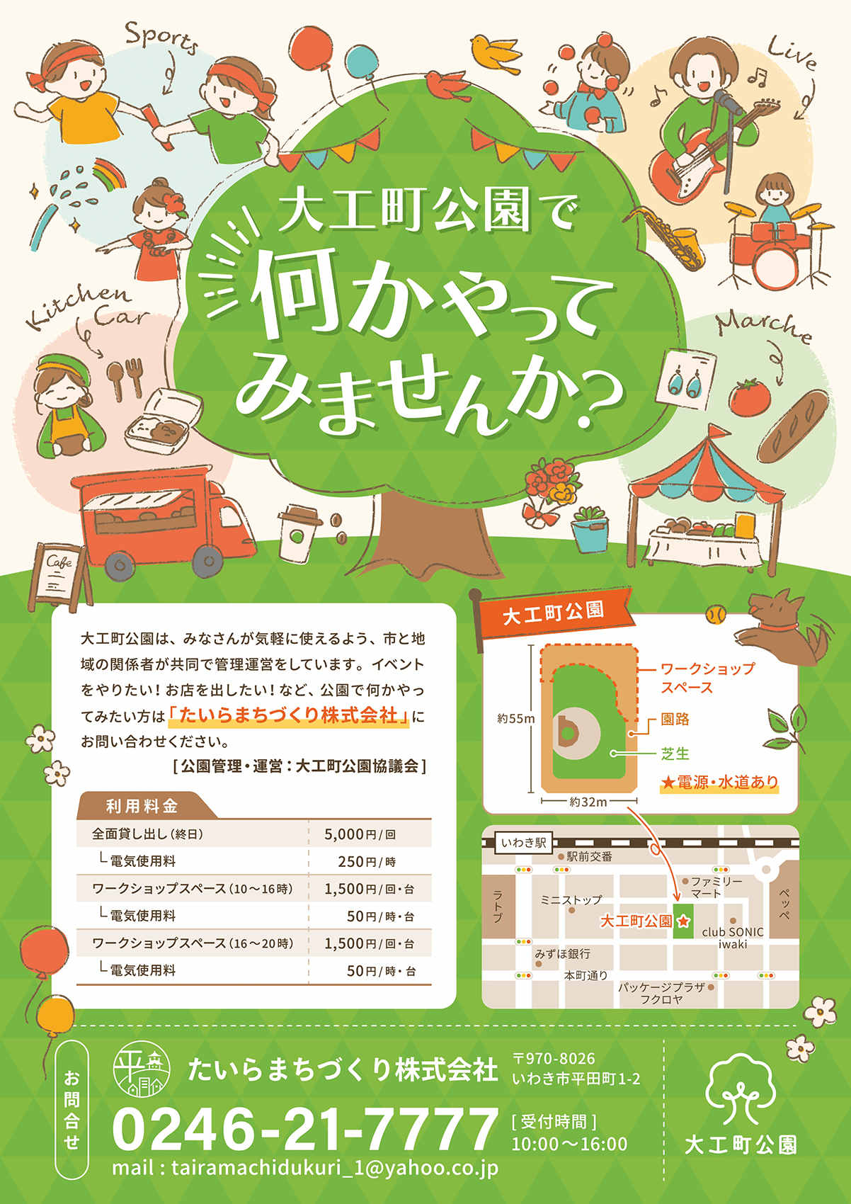 また、公園の日常的な管理や利用希望者の受付など、公園の管理運営全般をたいらまちづくり株式会社が担っております。